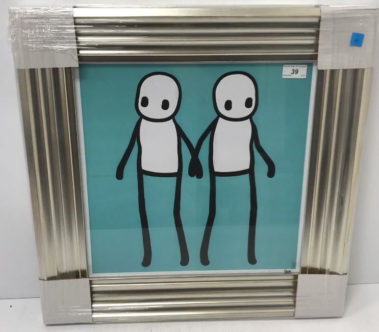 AFTER STIK "Two stickmen on coloured ground", colour print, in silvered frame, 54.5 cm x 54.5 cm including frame