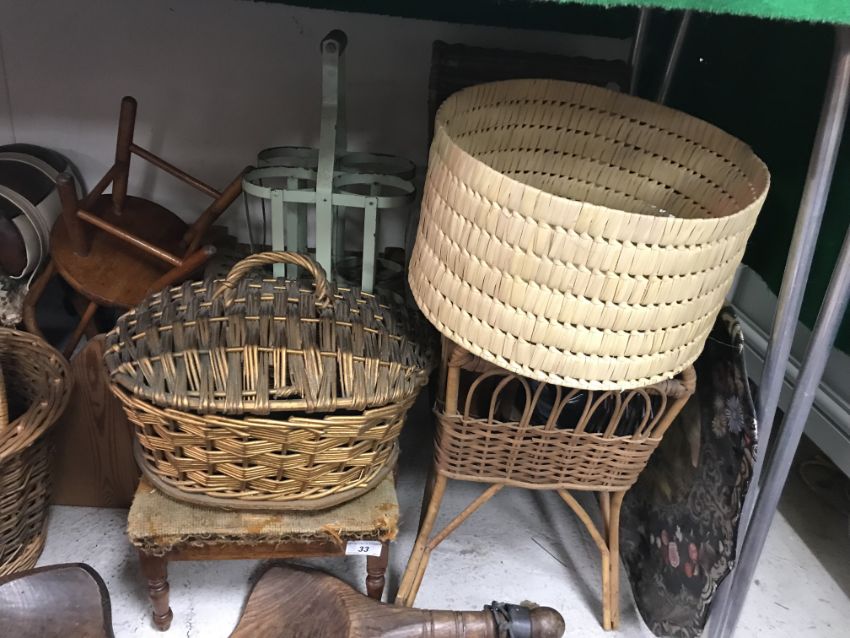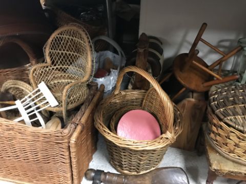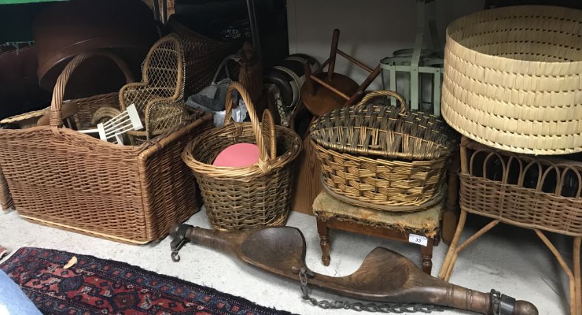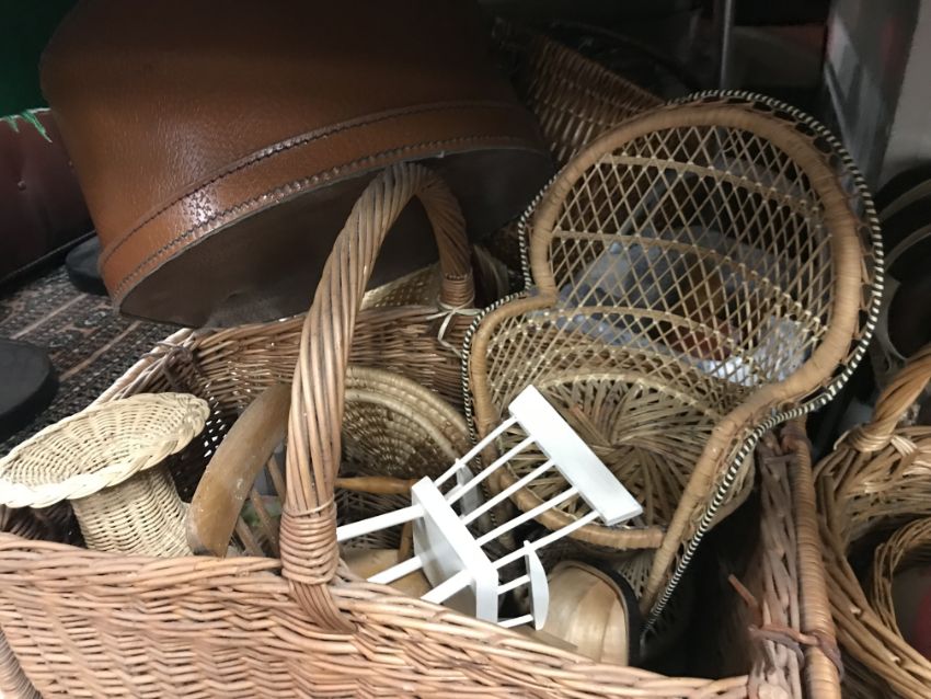 A quantity of assorted baskets and other decorative wares to include toy chairs, model chairs, hat box, yoke etc